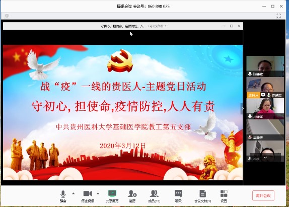 3月12日下午,1946伟德官方网站教工第五党支部围绕“守初心,担使命,疫情防控,人人有责”开展了一次特殊的党日活动,活动以腾讯会议的方式进行。本次活动邀请了1946伟德官方网站党委副书记王妤煜、副院长康颖倩、副处级组织员邓欣、教学质量监控科科长王涛以及1946伟德官方网站微生物学教研室研究生党员参加,活动由1946伟德官方网站党委委员、教工第五支部书记陈峥宏主持。
