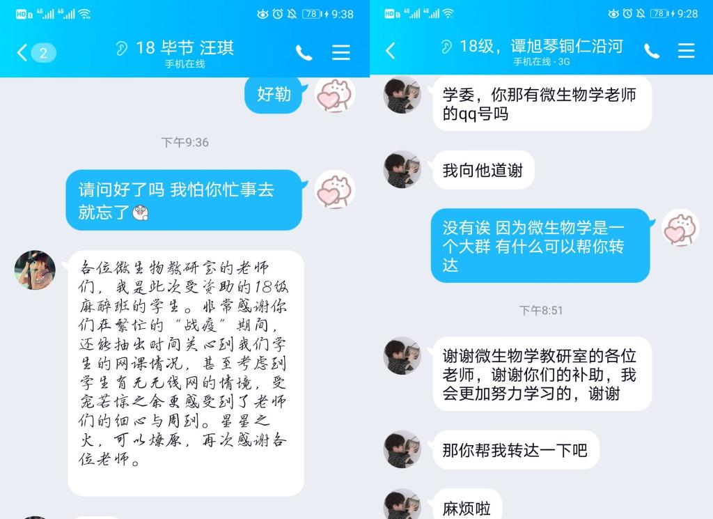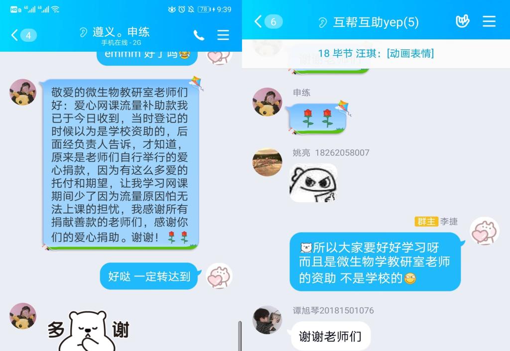 “疫情无情,大爱无疆”——以实际行动关爱贵医学子,前期党支部经过调研发现学校2018级有48位同学为精准扶贫对象,使用流量上课存在困难,为帮助贫困学生解决流量费,支部党员和微生物学教研室任课老师们自愿捐助了2800元,同时募集到公司赞助学生流量费2000元,解决了学生燃眉之急,受助学生纷纷发来短信和邮件表示一定努力学习,不辜负老师们的期望,綦廷娜老师表示能用自己的行动为疫情防控贡献一份力,帮助到贫困学生,感到很高兴。全体党员都以实际行动诠释了贵医人的使命和担当。